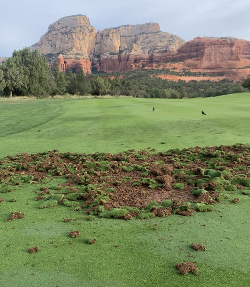 The video shows the result of a herd of javelina, which are native to Arizona, peeling back turf in search of a meal underneath the surface.