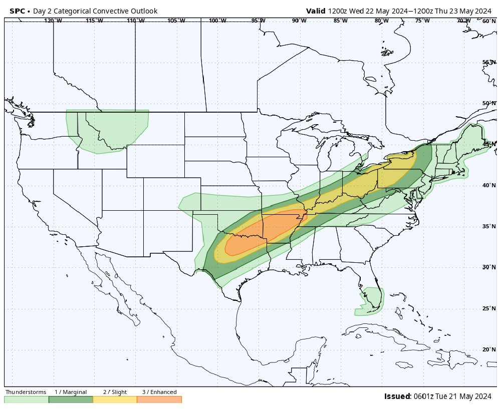 In the attached images, areas marked in the deeper colors will be where there is the highest risk for severe storms. Today (Tuesday) will be the worst day of the three with significant severe weather risk in the western portions of the Midwest and Great Lakes.