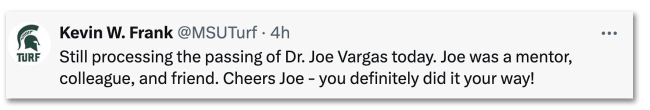 A fan of Elvis, Vargas became as widely known for his impersonations and performances at turf conferences as he was for his expertise in turf. He was the recipient of the 2007 USGA Green Section Award, the Michigan State Distinguished Faculty award in 2019 and the GCSAA Distinguished Service award in 1997. He was inducted into the Michigan Golf Hall of Fame in 2016.
